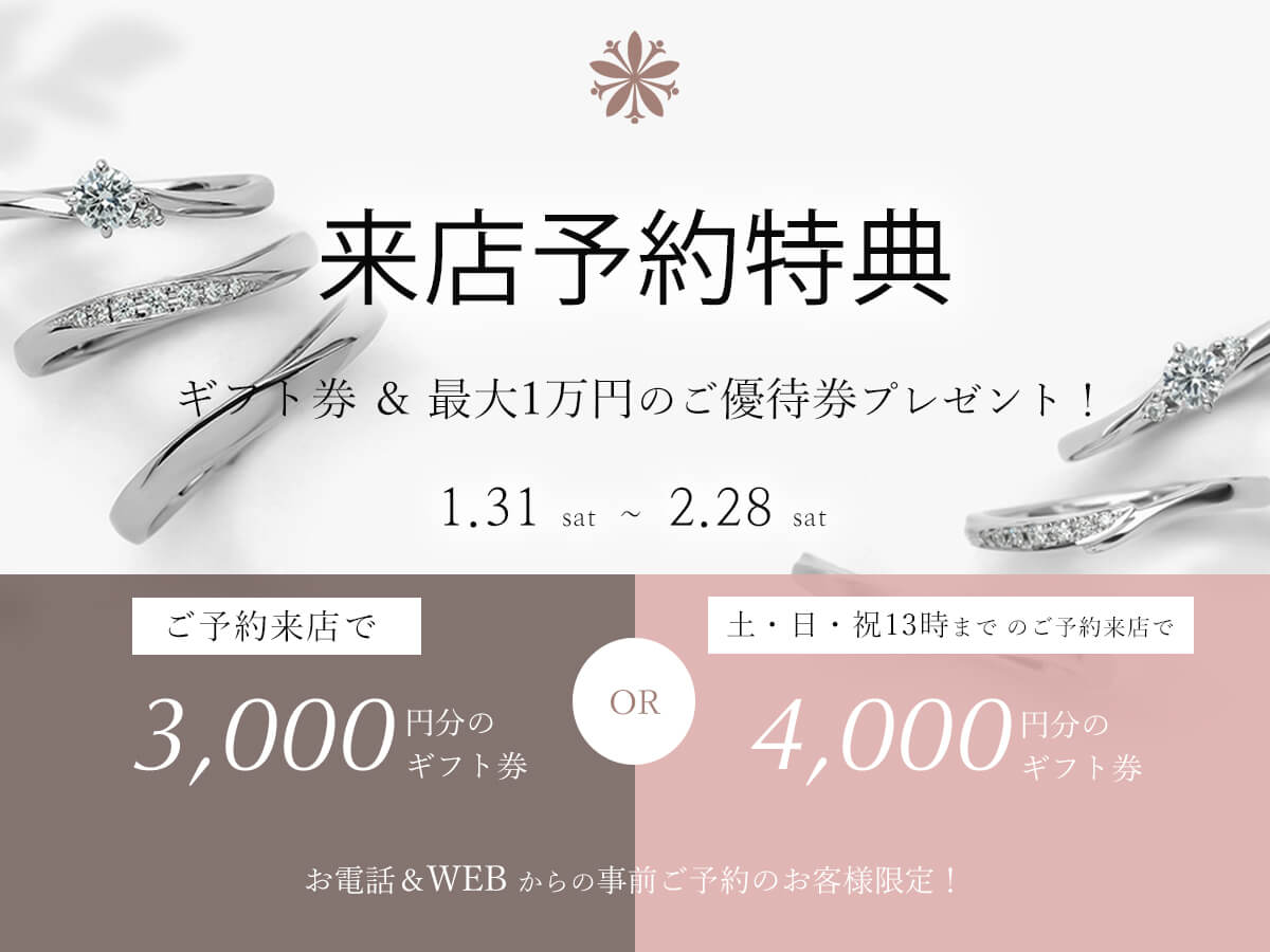 ※ WEBもしくはお電話にてご来店予約 & ご予約のお名前にてアンケート記入 & サプライズプロポーズのジュエリーをご検討の方を対象とさせていただいております。
