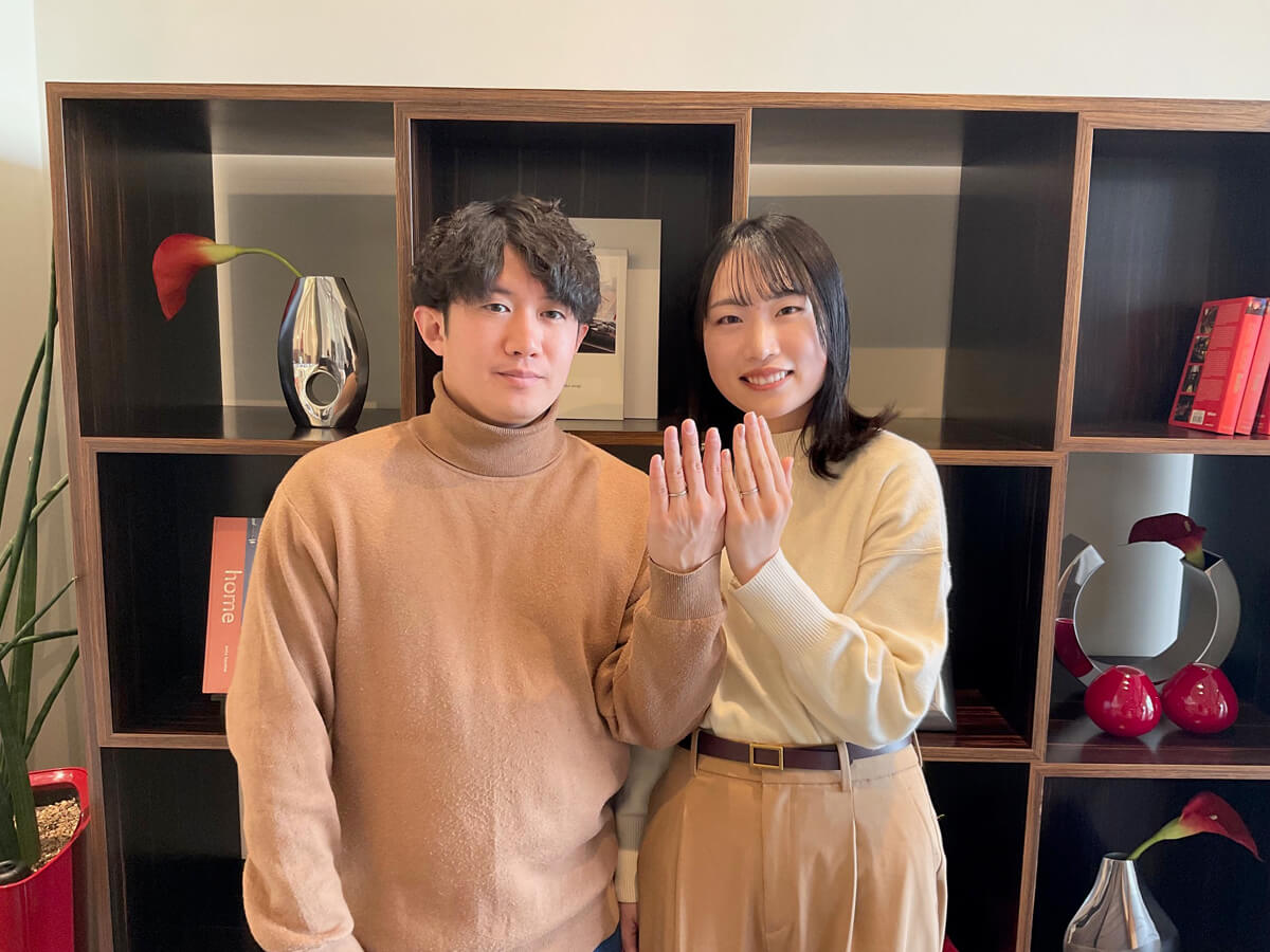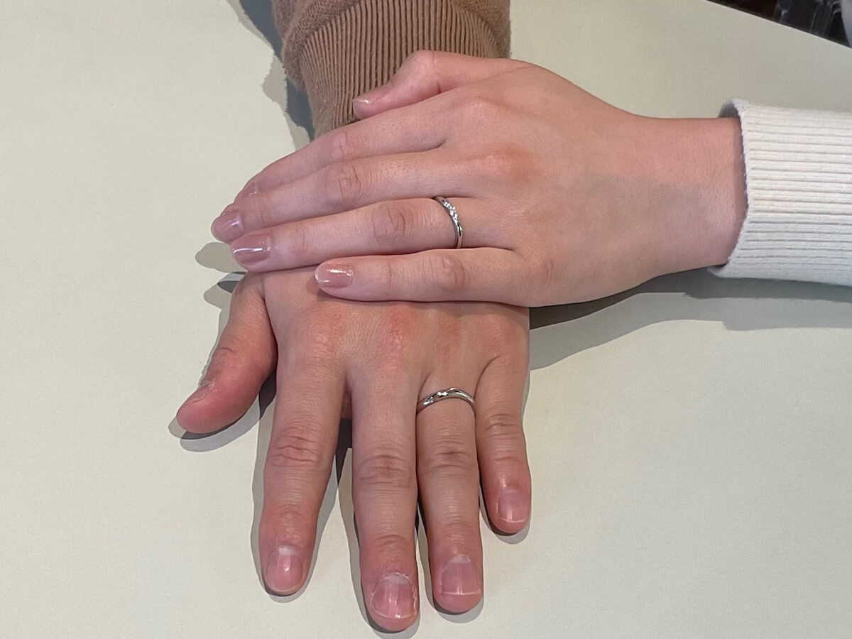 指輪をお受け取りの際も、おふたりに大変喜んでいただき、私自身も幸せのおすそ分けをいただいたような、温かい気持ちになりました。重ね着けしたときの美しさや、程よい輝き感も含め、おふたりらしい一本に出会っていただけたことを、私たちも大変嬉しく思っております。